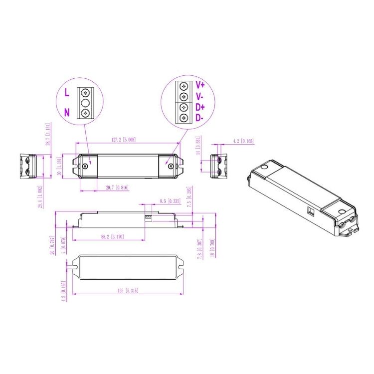 Dotato di grado di protezione IP20 e intervallo di ingresso 100-277V AC, assicura protezione contro cortocircuiti e sovratemperatura. Ideale per l’alimentazione di strisce e moduli LED in sistemi a tensione costante.