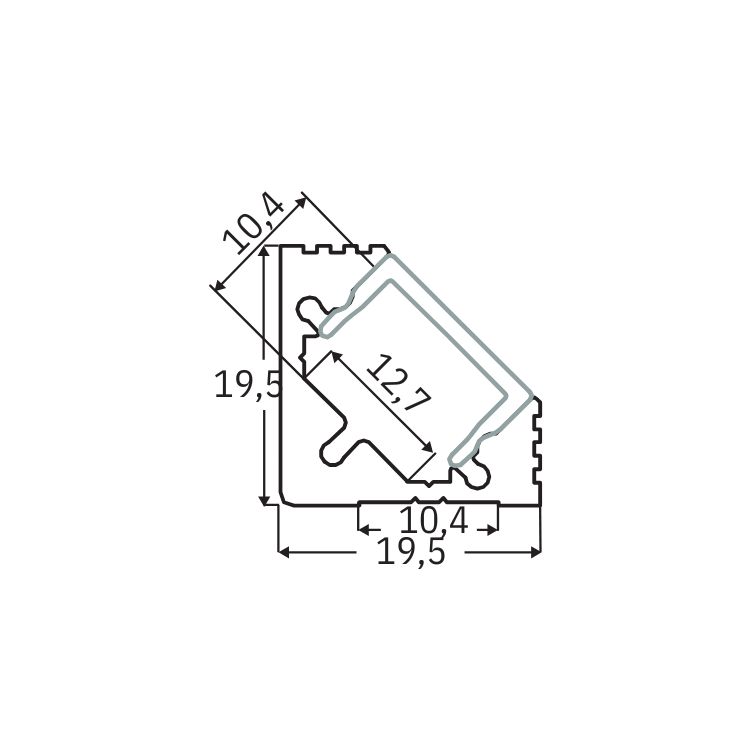 Profilo led in alluminio anodizzato antracite per montaggio ad angolo con diffusore in policarbonato opale. Adatto a strisce LED fino a 30 W/m e 12mm di larghezza.