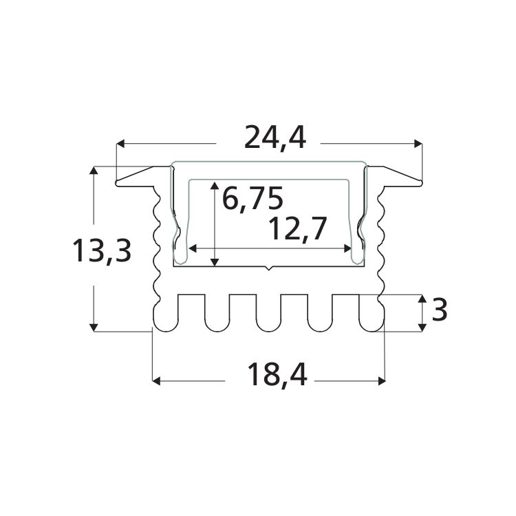 Profilo led in alluminio anodizzato ad alta dissipazione per installazione ad incasso. Completo di diffusore in policarbonato opale, è progettato per l’alloggiamento di strip LED fino a 50 W/m e 12mm di larghezza.