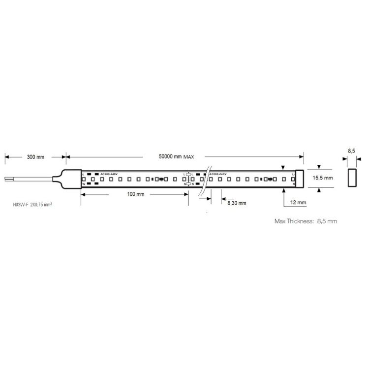 STRIP LED 6000 LED SMD 2835 230VAC 800W 50 MT CCT 3000K IP67 CRI80 PCB10MM WITH 50CM WHITE SHEATHED WIRE IN ONE SIDE AND END CAP & 3M ADHESIVE TAPE